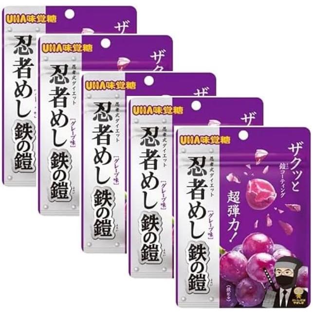 忍者めし鉄の鎧の魅力は、その独特な味わいと食感にあります。現在、主に流通しているのは「グレープ味」と、2025年2月に登場した「マスカット味」の2種類です。